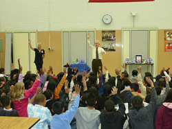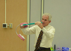 During the presentation - he uses large teeth to show them how to properly brush their teeth.